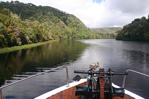 Wir haben die fast familiäre Atmosphäre auf dieser Fahrt dem „Gordon River Cruise“ in Strahanvorgezogen. Deren große Motorkatamarane sind schon sehr auf Massentourismus ausgelegt. |