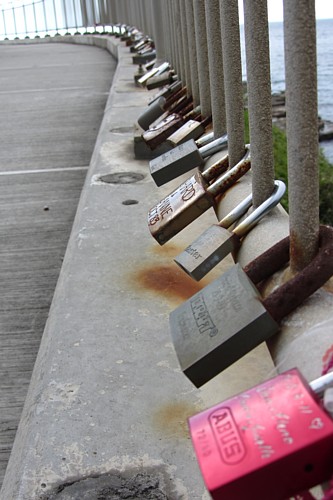 Die „Sea Cliff Bridge“ bei Stanwell Park ist eine um die Klippen ins Meer hinaus geführte Trasse. Sie ist inzwischen zu einer Art Wallfahrtsort geworden für alle, die als Symbol für die Beständigkeit ihrer Beziehung ein mit Namen graviertes Schloss befestigen. Hier endet für uns der Grand Pacific Drive.